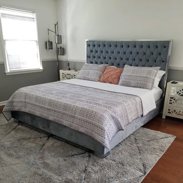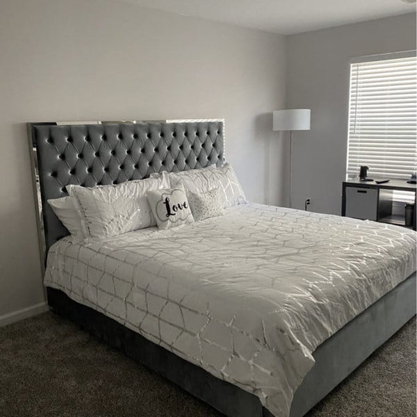 Olivia Velvet Tufted Upholstered Bed Frame Silver Chrome Edges - Dark Grey
